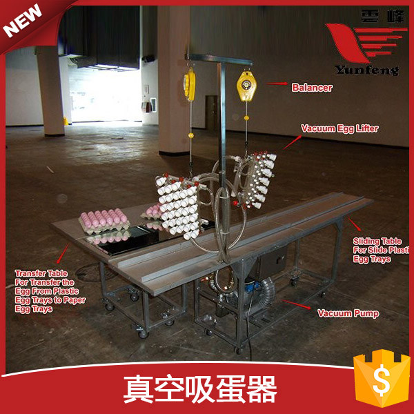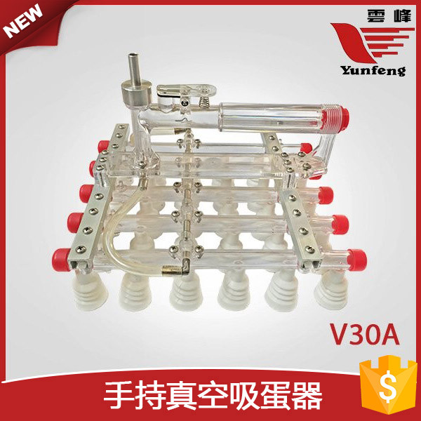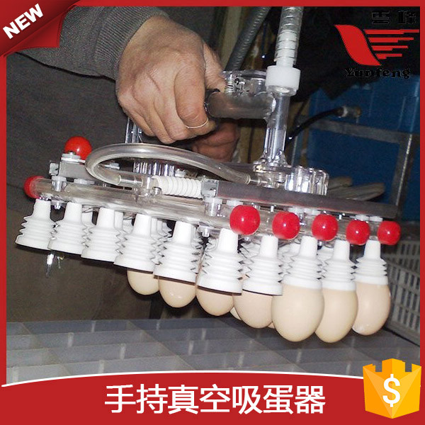 云峰真空吸蛋器为半自动设备。一组吸蛋器可为一或两台,每台都配备一个开关手柄,用于吸起或落下鸡蛋。