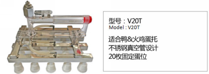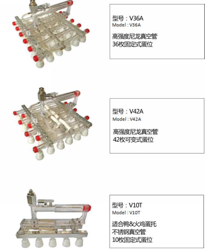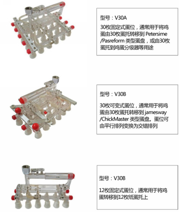 产品分为固定式及可变式蛋位。可变式可将吸蛋器变成Z字错位形状,可非常便捷的将鸡蛋从30枚蛋托转移到42枚孵化盘等。